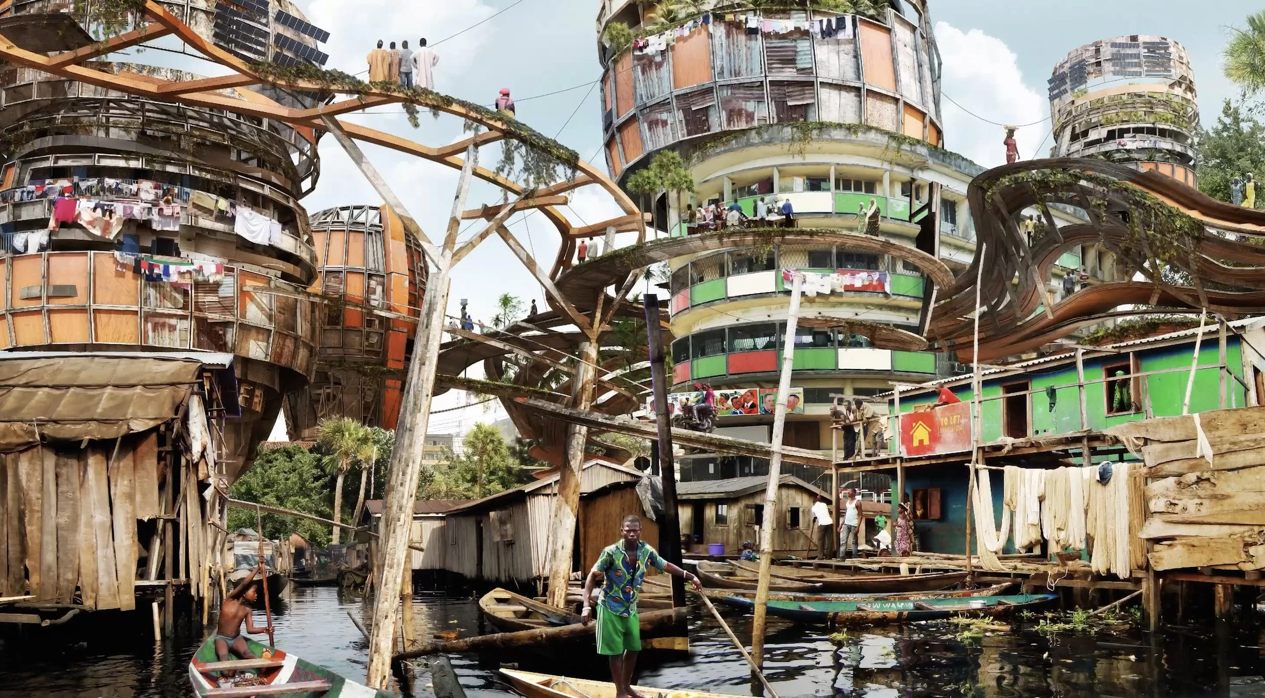 Step into the mind of Olalekan Jeyifous, a Nigerian-born, Brooklyn-based artist and architect known for crafting afrofuturist worlds that reimagine how cities could look, feel, and function, especially for historically marginalized communities. In this intimate profile, we visit Jeyifous’ studio in the rapidly gentrifying Crown Heights neighborhood of Brooklyn, exploring how he blends architecture, VR, collage, 3D modeling, and public art to create vibrant alternate realities. We take a walk with him to see how he collects everyday urban details— graffiti, ghost signs, surveillance tech, or a patch of overgrown sidewalk— and expands them into immersive visual landscapes where communities thrive on their own terms.